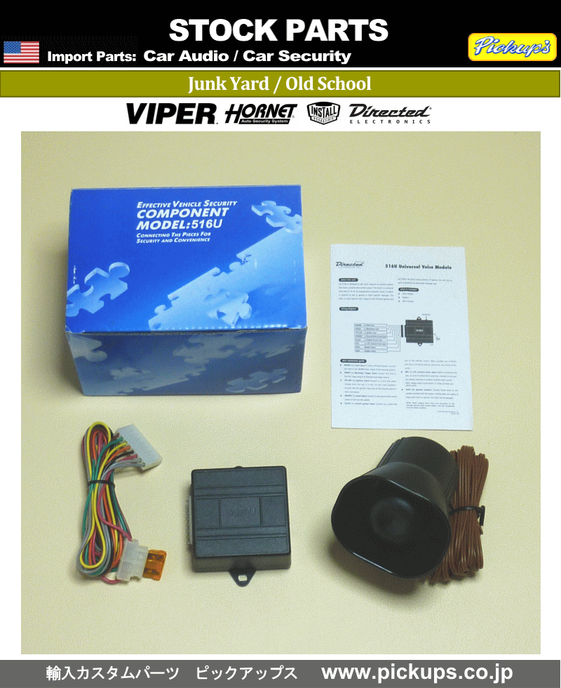 ご注意下さい。 殆ど1点限りの国内在庫品です。 無くなり次第終了します。 他でも販売しています。 事前に在庫確認をお願いします。 ![]() Global Headquarters 2351 J.Lawson Blvd. Orlando,FL32824 VIPER / Clifford / INSTALL アメリカでも入手困難な ヴィンテージ パーツです。 Import Parts since 1987 ピックアップス ボイス モジュール DEI-516U ● システム操作時・異常検出時 メッセージを出力します。 英語/スペイン語が選べます。 ■ メーカー DEI社純正のアメリカ仕様です。 ★★★ DEI社純正セキュリティ製品の 補修・交換・追加用パーツです。 単品・他社製品には 使用できません。 ご注意下さい。 ■ コンディション 長期在庫の新品です。 現行のセキュリティ本体に 使用できない商品もあります。 ★★★ 製造・販売が終了してから かなり時間が経過した製品です。 現地アメリカでも、 入手はかなり困難な 希少品・貴重品です。 構成内容 画像が全てです。 慎重にご確認下さい。 ■ 販売数量 1個 ★ 取付説明書 製品に添付された英語版のみです。 添付されない製品もあります。 日本語の取付説明書 添付されません 取り付けサポート 行っておりません。 取付実績の有る 専門ショップの方にお勧めします。 ご了承下さい。 ■■■ お問い合わせ、ご注文方法は コノページの下をご覧下さい。 参考資料 長く更新していません。 パソコンでご覧下さい。 ![]() 総合インデックス ★ 保証は有りません。 新品・中古品に関わらず 初期不良も含めて保証はありません。 ベースユニットなど 構成品の全てが保証対象外です。 未使用品(新品)は未通電です。 動作確認は行っていません。 リモコン電池 製品付属品・リモコン単品を含め 電池交換が必要です。 電池の販売は行っていません。 又、 リモコンの登録に関しても サポートしていません。 十分ご注意下さい。 ■ 出荷後は 返品・交換はお受けできません。 慎重にご検討下さい。 ★★★ 出荷前に 破損などは目視検査をしています。 輸送中の破損に関しては 運送会社とご相談下さい。 ◆ 業販価格の設定はありません。 ご了承ください。 ■ 東京からの送料が必要です。 下表をご参照下さい。 ■■■ お問い合わせ、ご注文方法は コノページの下をご覧下さい。 ■ 新品と中古品があります。 長期在庫品のため、保証は有りません。 ■ 【 新品 】 未使用の新品です。 オーディオ・セキュリティ製品は 動作確認をしていないため 未通電です。 ■ 【 中古品 】 使用状況は様々です。 状態・程度 感覚的な判断となるため 表記しません。 現品を優先します。 ■ 【 出荷前検品 】 破損・欠品は検品を行います。 オーディオ・セキュリティ製品は 通電による動作検品は行いません。 ■ 【 画像 】 メーカー・代理店の画像が含まれます。 現品と多少異なる場合があります。 イメージとしてご覧下さい。 【 お願い 】 ★ 新品・中古品共に ノークレームでお願いします。 返品・交換は 一切お受けできません。 ● その他の パーツ 弊社ホームページをご参照下さい。 www.pickups.co.jp 輸入カスタムパーツ ピックアップス ■■■■ ![]() 在庫確認などにご利用下さい。 ★ お問い合わせ内容について 適合車種等 イモビライザー バイパスモジュール、 ドアロック インターフェースなど 一部の車種別商品を除いて 適合車種の設定は有りません。 このため、 ご質問いただいてもお答えできません。 あらかじめご了承下さい。 取り付けなどをはじめ 技術的なお答えはできません。 ご了承下さい。 ご注文方法・ご注文フォームなどは こちらをご参照下さい。