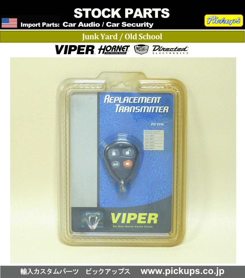 ご注意下さい。 殆ど1点限りの国内在庫品です。 無くなり次第終了します。 他でも販売しています。 事前に在庫確認をお願いします。 ![]() Global Headquarters 2351 J.Lawson Blvd. Orlando,FL32824 VIPER / Clifford / INSTALL アメリカでも入手困難な ヴィンテージ パーツです。 Import Parts since 1987 ピックアップス トランスミッター 1ウェイ・4ボタン DEI-474V ● 適合ベースユニット 560XV/650XV/850XV 160XV/210HV ■ メーカー DEI社純正のアメリカ仕様です。 ★★★ DEI社純正セキュリティ製品の 補修・交換・追加用パーツです。 単品・他社製品には 使用できません。 ご注意下さい。 ■ コンディション 長期在庫の新品です。 現行のセキュリティ本体に 使用できない商品もあります。 ★★★ 製造・販売が終了してから かなり時間が経過した製品です。 現地アメリカでも、 入手はかなり困難な 希少品・貴重品です。 構成内容 画像が全てです。 慎重にご確認下さい。 ■ 販売数量 1個 ★ 取付説明書 製品に添付された英語版のみです。 添付されない製品もあります。 日本語の取付説明書 添付されません 取り付けサポート 行っておりません。 取付実績の有る 専門ショップの方にお勧めします。 ご了承下さい。 ■■■ お問い合わせ、ご注文方法は コノページの下をご覧下さい。 参考資料 長く更新していません。 パソコンでご覧下さい。 ![]() 総合インデックス ★ 保証は有りません。 新品・中古品に関わらず 初期不良も含めて保証はありません。 ベースユニットなど 構成品の全てが保証対象外です。 未使用品(新品)は未通電です。 動作確認は行っていません。 リモコン電池 製品付属品・リモコン単品を含め 電池交換が必要です。 電池の販売は行っていません。 又、 リモコンの登録に関しても サポートしていません。 十分ご注意下さい。 ■ 出荷後は 返品・交換はお受けできません。 慎重にご検討下さい。 ★★★ 出荷前に 破損などは目視検査をしています。 輸送中の破損に関しては 運送会社とご相談下さい。 ◆ 業販価格の設定はありません。 ご了承ください。 ■ 東京からの送料が必要です。 下表をご参照下さい。 ■■■ お問い合わせ、ご注文方法は コノページの下をご覧下さい。 ■ 新品と中古品があります。 長期在庫品のため、保証は有りません。 ■ 【 新品 】 未使用の新品です。 オーディオ・セキュリティ製品は 動作確認をしていないため 未通電です。 ■ 【 中古品 】 使用状況は様々です。 状態・程度 感覚的な判断となるため 表記しません。 現品を優先します。 ■ 【 出荷前検品 】 破損・欠品は検品を行います。 オーディオ・セキュリティ製品は 通電による動作検品は行いません。 ■ 【 画像 】 メーカー・代理店の画像が含まれます。 現品と多少異なる場合があります。 イメージとしてご覧下さい。 【 お願い 】 ★ 新品・中古品共に ノークレームでお願いします。 返品・交換は 一切お受けできません。 ● その他の パーツ 弊社ホームページをご参照下さい。 www.pickups.co.jp 輸入カスタムパーツ ピックアップス ■■■■ ![]() 在庫確認などにご利用下さい。 ★ お問い合わせ内容について 適合車種等 イモビライザー バイパスモジュール、 ドアロック インターフェースなど 一部の車種別商品を除いて 適合車種の設定は有りません。 このため、 ご質問いただいてもお答えできません。 あらかじめご了承下さい。 取り付けなどをはじめ 技術的なお答えはできません。 ご了承下さい。 ご注文方法・ご注文フォームなどは こちらをご参照下さい。